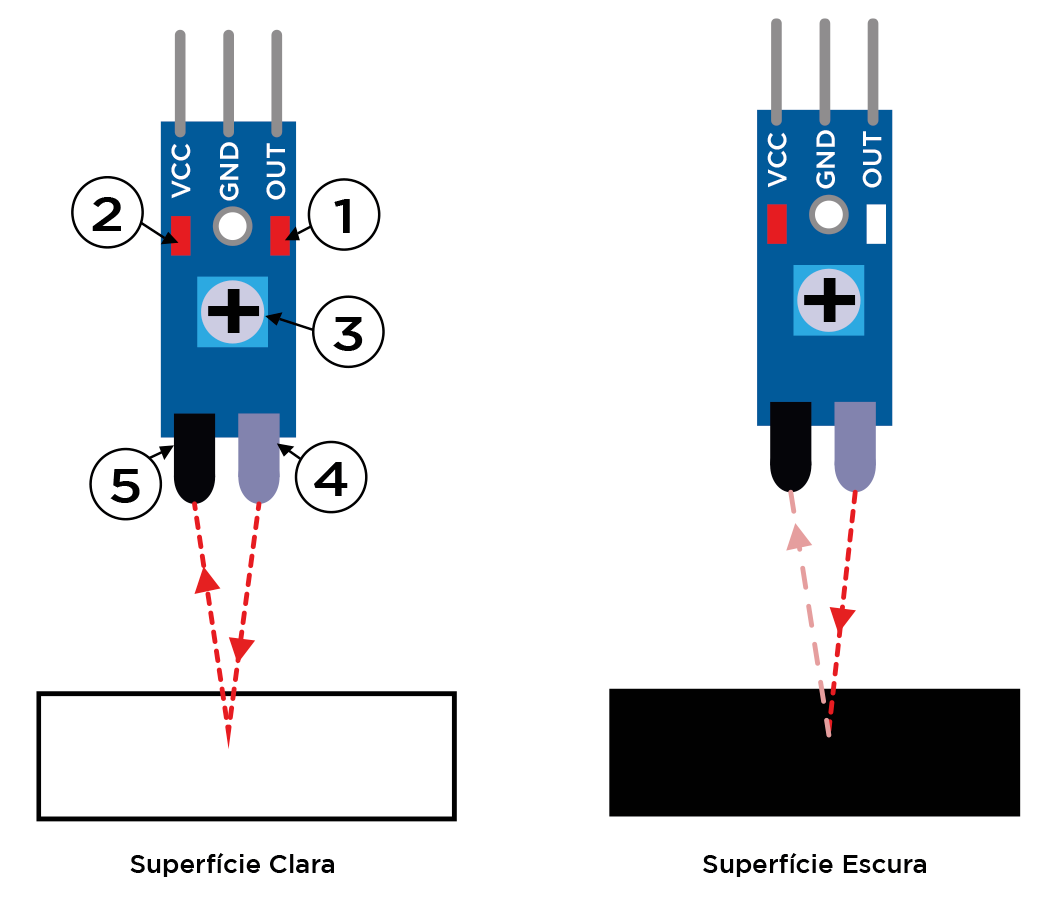 e 2. Quando o sensor detecta uma superfície clara, ambas as